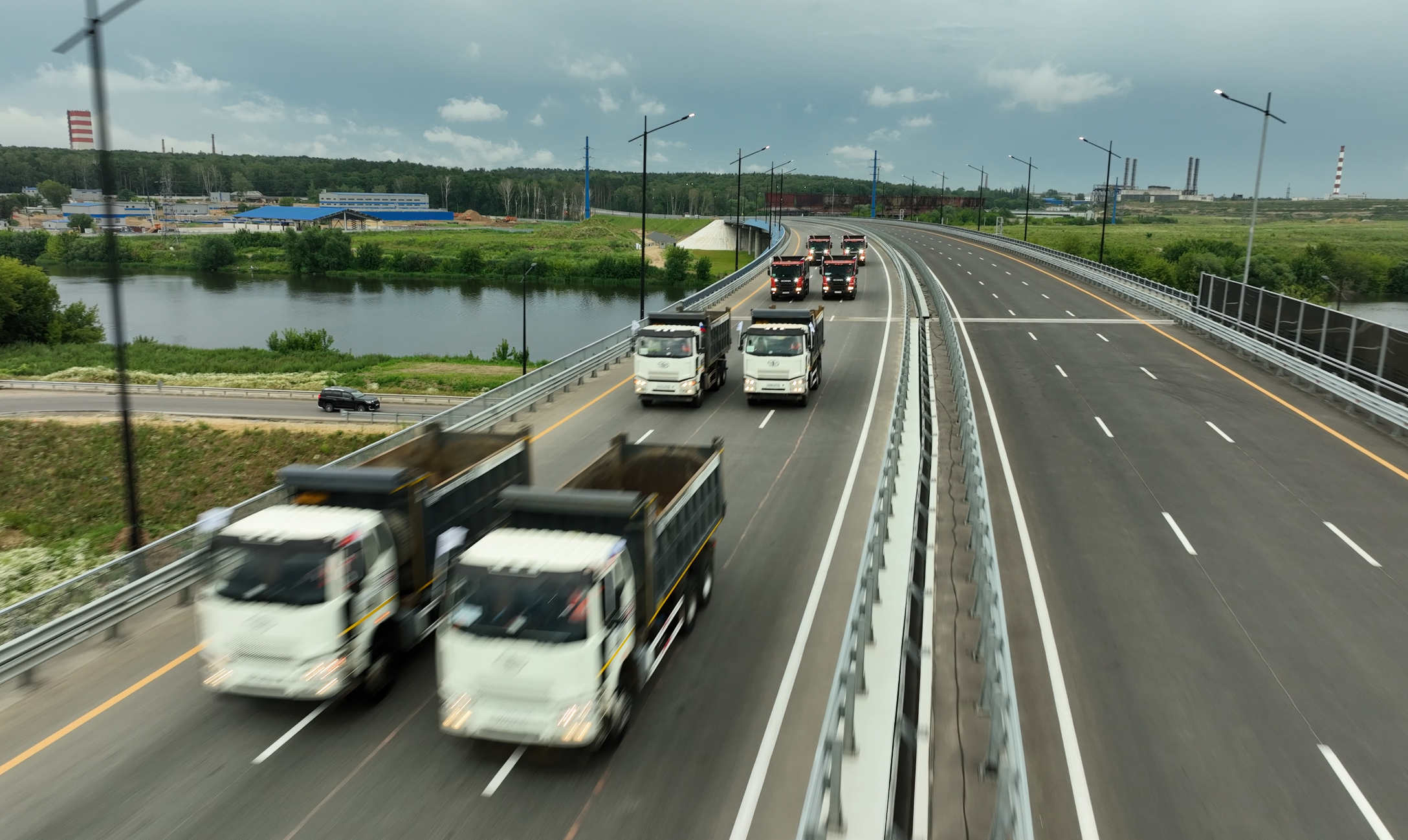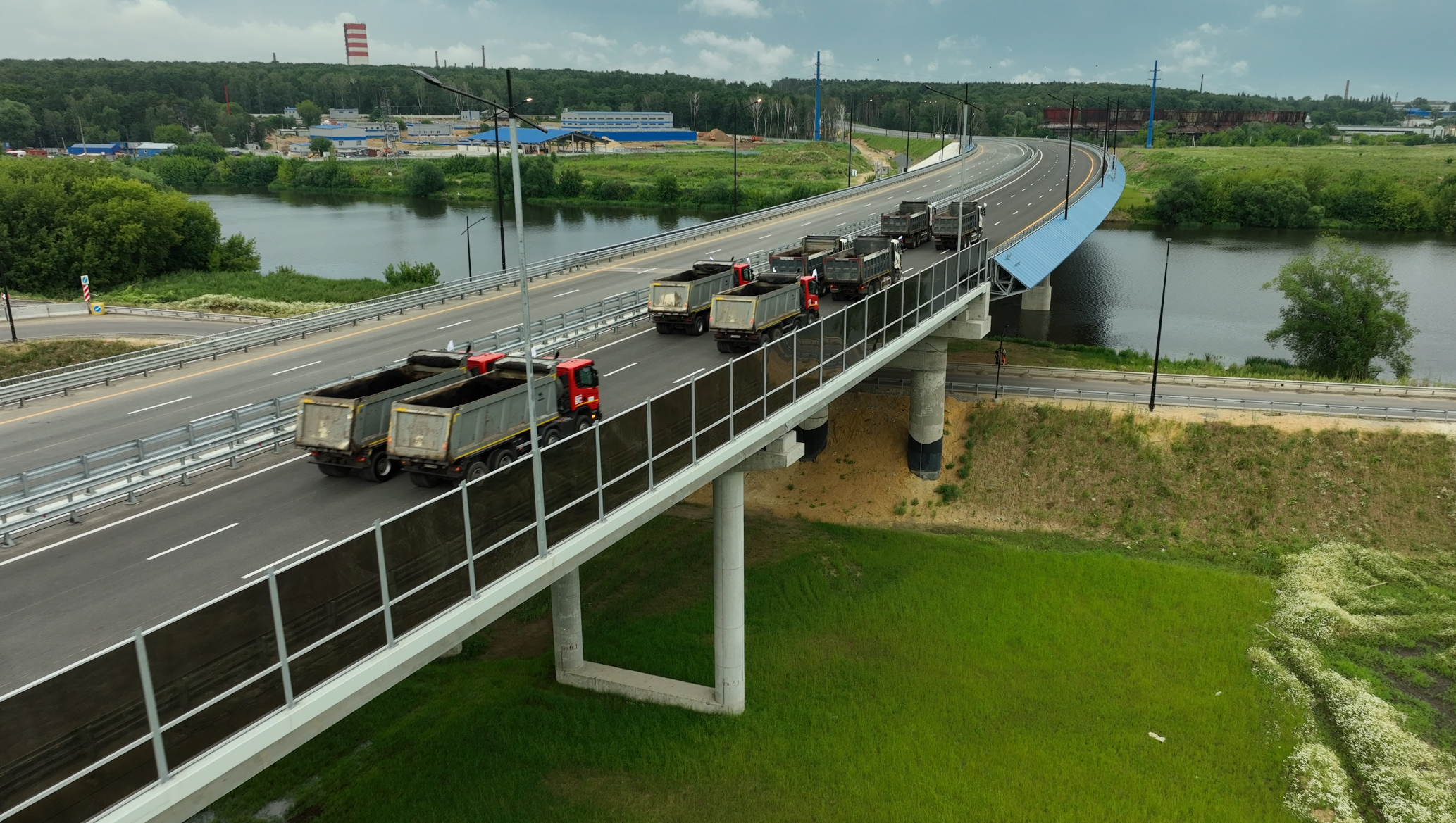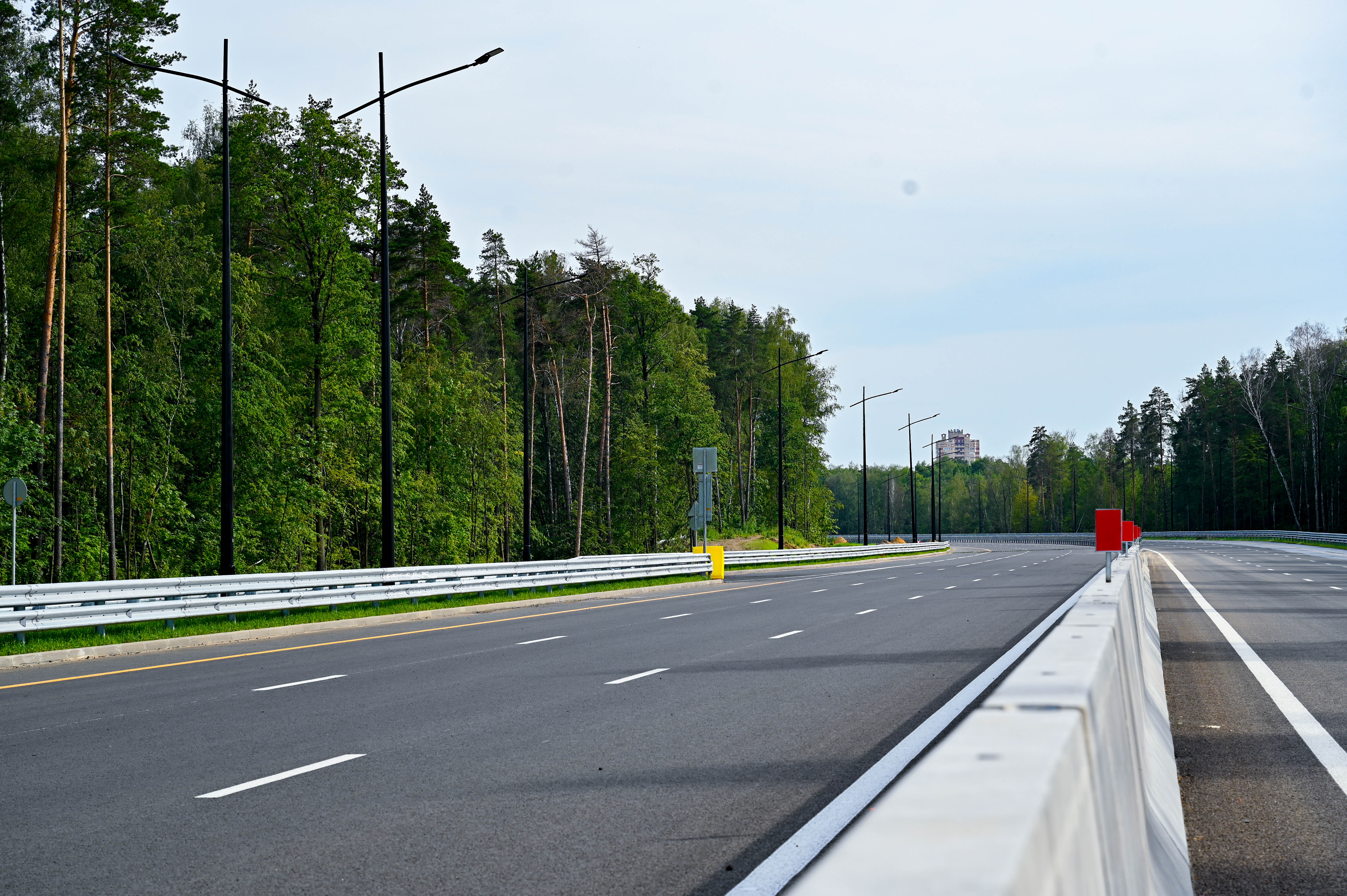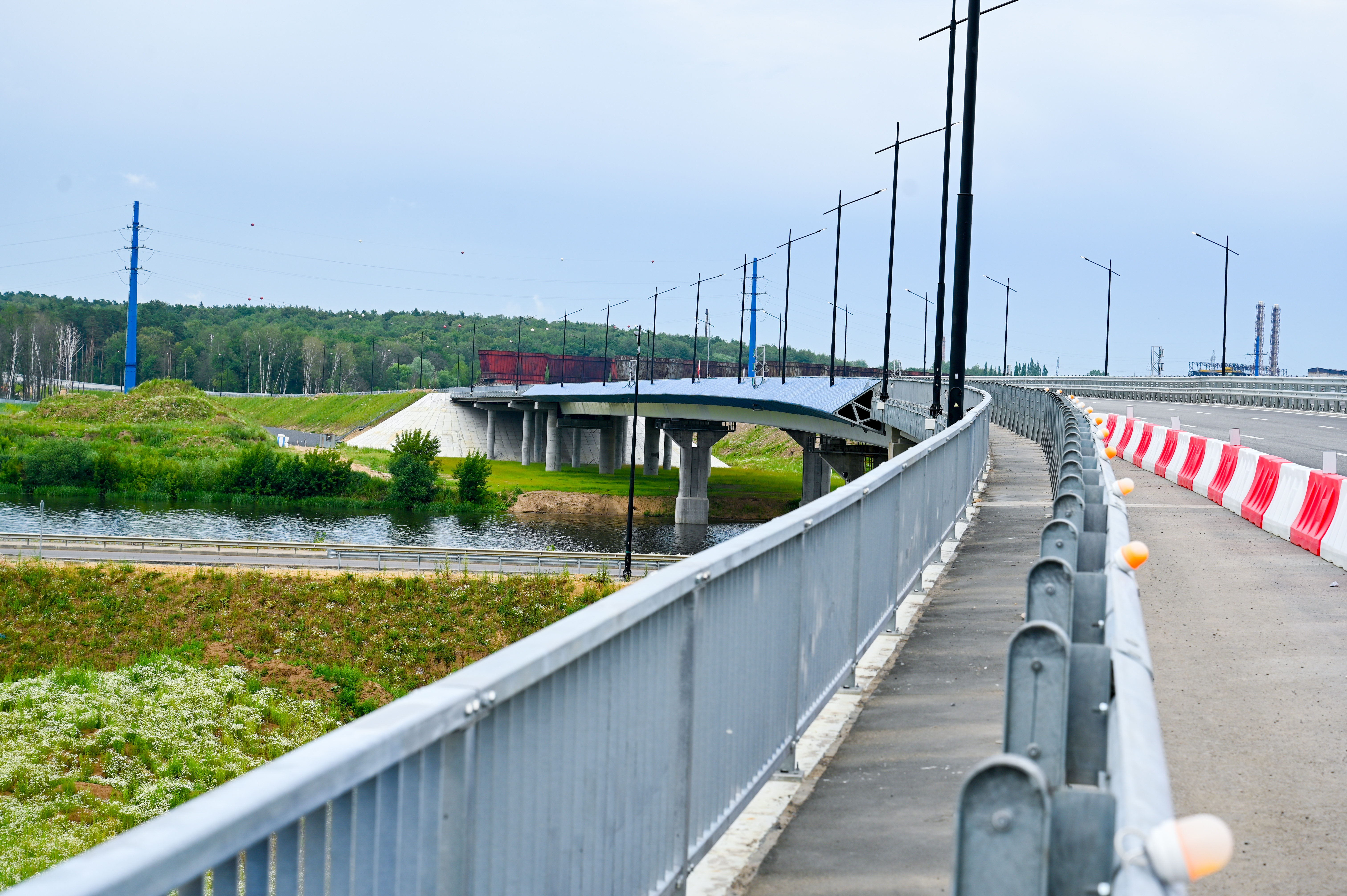 Один из самых значимых объектов на новой трассе — мост через Москву-реку. Его длина составляет 590 пог. м, включая русловое пролетное строение 318 пог. м. Он имеет центральный судоходный пролет длиной 130 м, обеспечивающий габарит для судов 13,5 м. Его строительство велось с августа 2022 года.